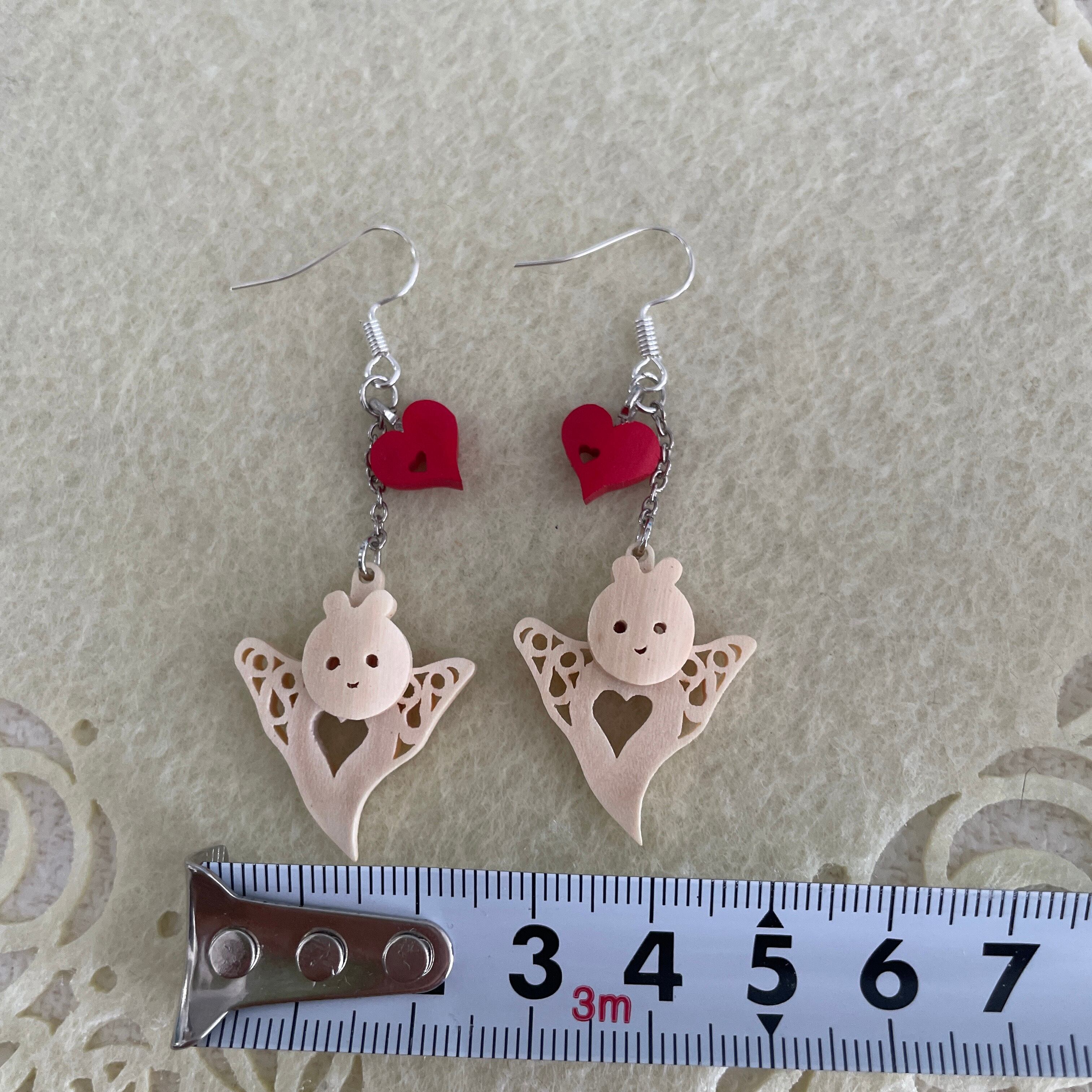 木製のクリオネスピアス、ハート型のデザインです。お色は、情熱的な赤色です。このピアスには、クリオネをモチーフにした可愛らしい形状が特徴で、見る人の心を温かく包みます。しっかりした木の素材感と、手作りならではの個性が感じられ、特別な存在を引き立てます。